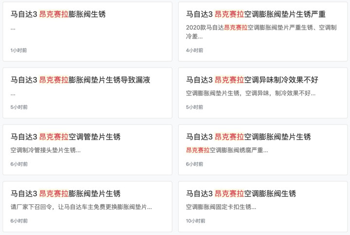 据悉,今年1月10日,一位该车型车主在修车后,将空调膨胀阀生锈问题发布至网络。此举引发众多长安马自达3 昂克赛拉车主关注,车主们纷纷发现自家车也出现了该问题。