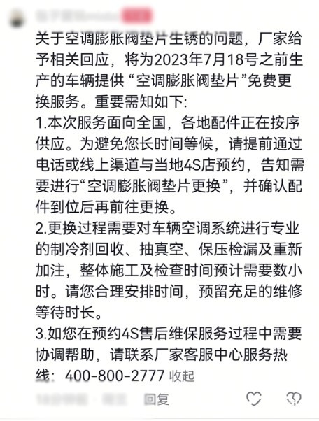 值得注意的是,有小道消息称,马自达厂家已对空调膨胀阀垫片生锈问题做出回应,厂家将为2023年7月18日之前生产的车辆提供“空调膨胀阀垫片”免费更换服务。