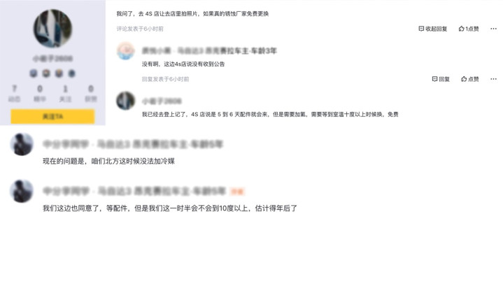 不过,部分长安马自达3 昂克赛拉车主表示,4s店已同意为其免费更换相关部件。但车辆需要加氟,而加氟需要室温达到10度以上,北方车主不得不等待至年后。