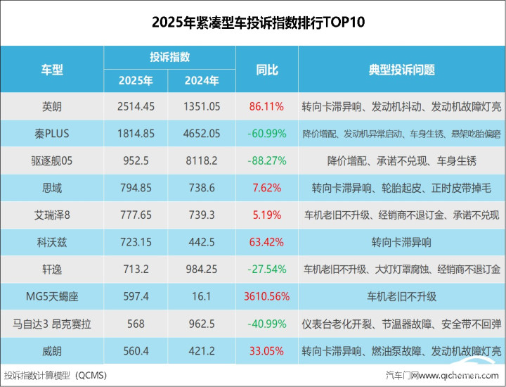 近日,汽车门网盘点了2025年度各个类型投诉榜单。此前发布的三期内容,我们已经对车企、车型、SUV投诉榜单的TOP10展开分析。为进一步帮助消费者掌握核心汽车品类的投诉态势,本期内容我们发布2025年度紧凑型车投诉指数排行。