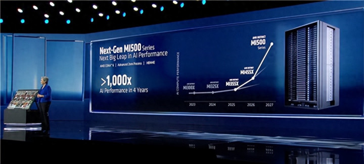 明年则会推出MI500系列,CES展会上AMD也透露了更多信息,MI500系列的GPU会升级为CDNA6架构,台积电2nm工艺,搭配速度更快的HBM4e内存。