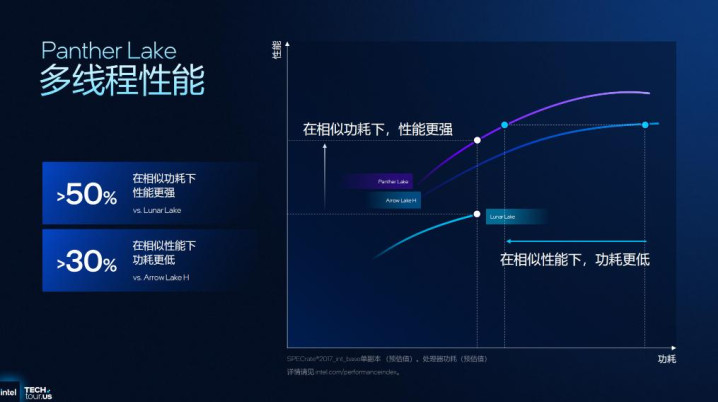 架构上,酷睿Ultra回归“性能核+能效核+低功耗能效核”的混合设计,但核心全面升级。根据官方数据显示,在中低负载下单核能效比上代Lunar Lake提升明显,而多核性能在相同功耗下比Lunar Lake强50%。