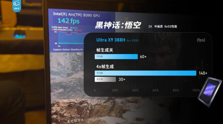更值得一提的是,酷睿Ultra的12核Xe3架构核显,对比Lunar Lake性能提升 77%,英特尔官方称其堪比60W的RTX 4050。对此,云飞也在现场亲自实测了《黑神话:悟空》,在1080P中画质下,这款核显竟能跑出 67帧的流畅成绩,若开启XeSS 3.0帧生成,冲击140帧以上也不在话下。这意味着,哪怕是没有独显的轻薄本,也能轻松驾驭主流3A大作,甚至满足轻度游戏玩家的需求。