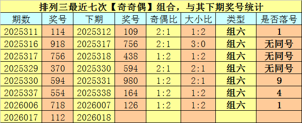 奇偶分析:排列三上期奖号为112,其奇偶类型为【奇奇偶】,最近七次出现奇偶类型奇奇偶的号码分别为:114、918、756、370、594、554、718,其下期奖号分别为:114、918、756、370、594、554、718。其中号码奇偶比为10:11,开云中国app登录入口奇偶奖号开出比例基本相当,本期奇数热出的可能性较大,预计出现2个奇数号码。