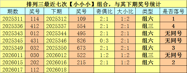开奖回顾:排列三第2026017期开奖号码为:112。奖号类型为:组三,大小类型为:小小小,奇偶类型为:奇奇偶,包含重号:1 2。