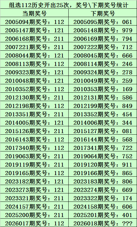 上期回顾:排列三第2026017期奖号为:112,类型:组三,历史上直选号码112出现了8次,组选号码112出现了25次。