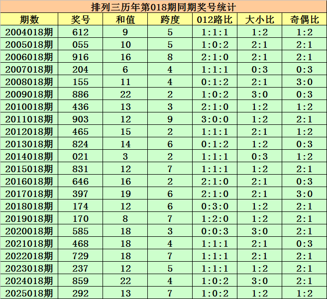 历史上第2026018期排列三已开出22期奖号了,历年同期奖号分别为:612、055、916、204、155、886、436、903、465、824、021、831、646、397、174、170、585、468、729、237、859、292,详细统计见下表: