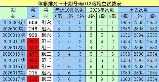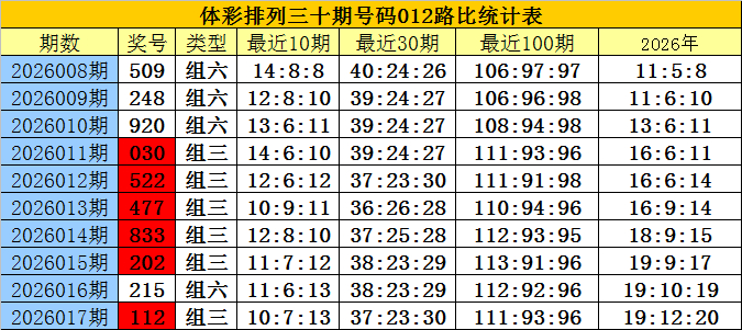 开奖回顾:排列三第2026017期奖号为:112,号码012路比为0:2:1。