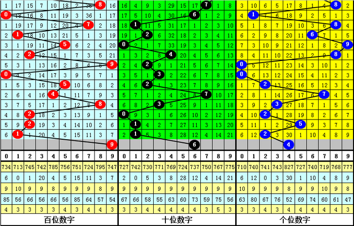 1路奖号上期开出了2个,前10期共开出7个出现相对较少,其中1出现3个、4出现2个、7出现2个,本期适当关注1路号码出现,参考4。