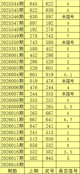 福彩3D第2026017奖号945,重号落号。在最近100期(第2025269期-2026017期)中,重号落号71期;最近20期重号落号概率为85%;最近10期重号落号概率为100%。本期防重号中号码轮空。