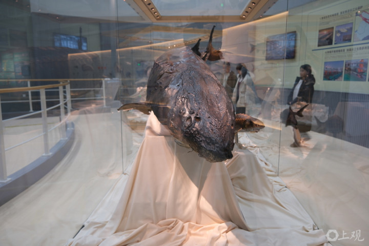 水野中心内科普馆的“镇馆之宝”,是一尾中华鲟标本。它长3.5米,重350公斤。2007年7月17日在金山区杭州湾水域误入渔网受伤,经全力救治成功存活1232天,在2010年12月1日死亡,创下当时国内抢救救治中华鲟最长存活纪录郜阳摄