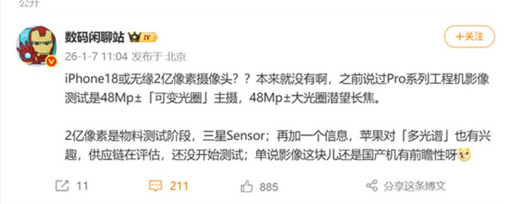 今日,博主“数码闲聊站”发文辟谣,驳斥了此前有关iPhone 18将搭载2亿像素摄像头的传闻,表示“本来就没有”。他透露,目前iPhone 18 Pro系列的影像测试配置已确定,包括4800万像素主摄和可变光圈,以及4800万像素的大光圈潜望式长焦镜头。尽管关于2亿像素的讨论不断,但该配置仅处于物料测试阶段,并未被实际采用。