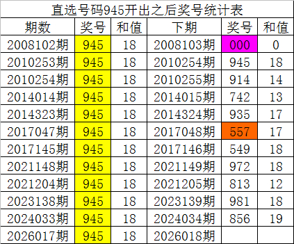 一、上期回顾:福利彩票3D第2026017期开奖结果:奖号为945,奖号和值为:18,奖号跨度为:5。