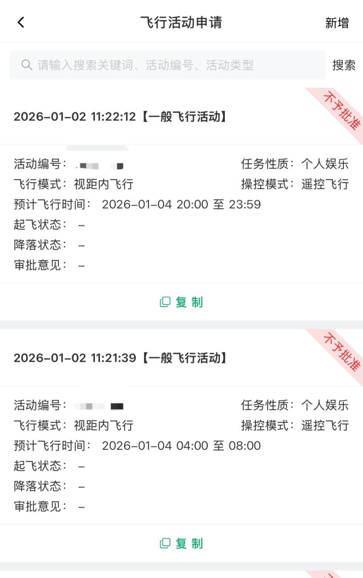 受访者提供 飞行活动申请记录